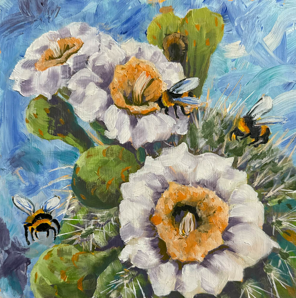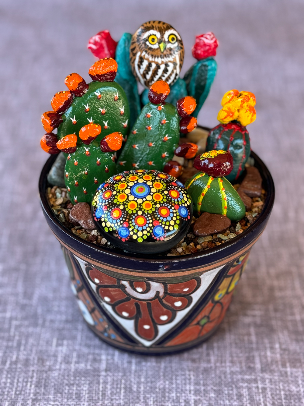 My Rock Cactus pots are so fun!!! I create individual cactus by seeking rocks that feel like they want to be cacti. These little assemblages are painted in vivid hues that capture the excitement of desert blooms. I teach a class on creating these pots in my Del Webb community.