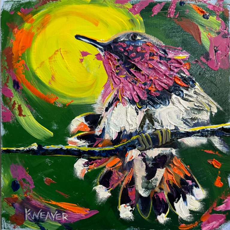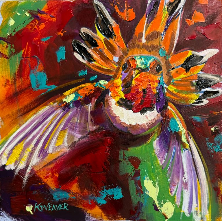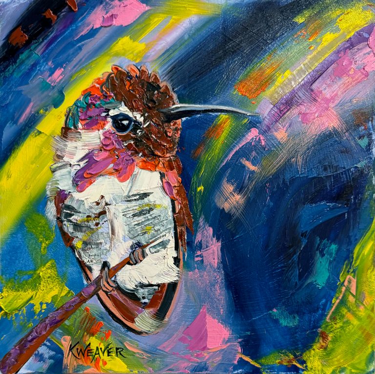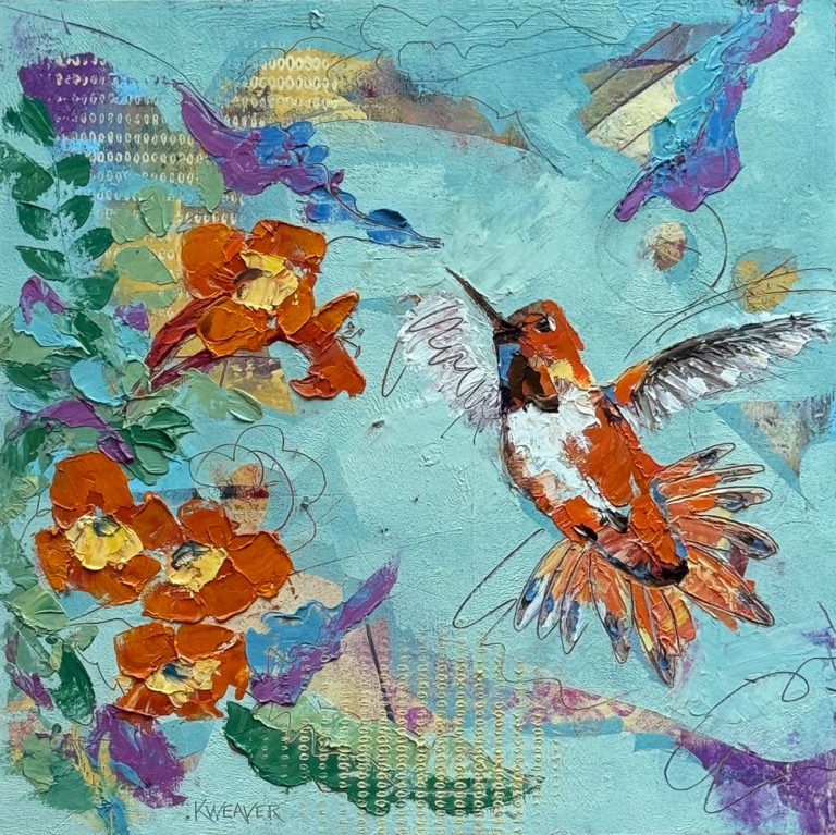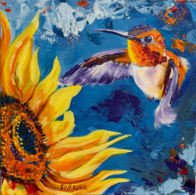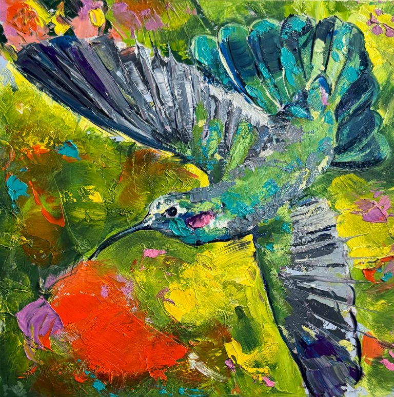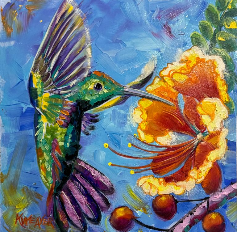 The beauty of oil paint is the ability to blend colors. It’s the perfect medium for creating impressions of our captivating Sonoran desert sunsets and soft, colorful backgrounds for our numerous birds and lovely florals. I also have a lot of fun using painting knives to apply thick paint and create textured floral representations.