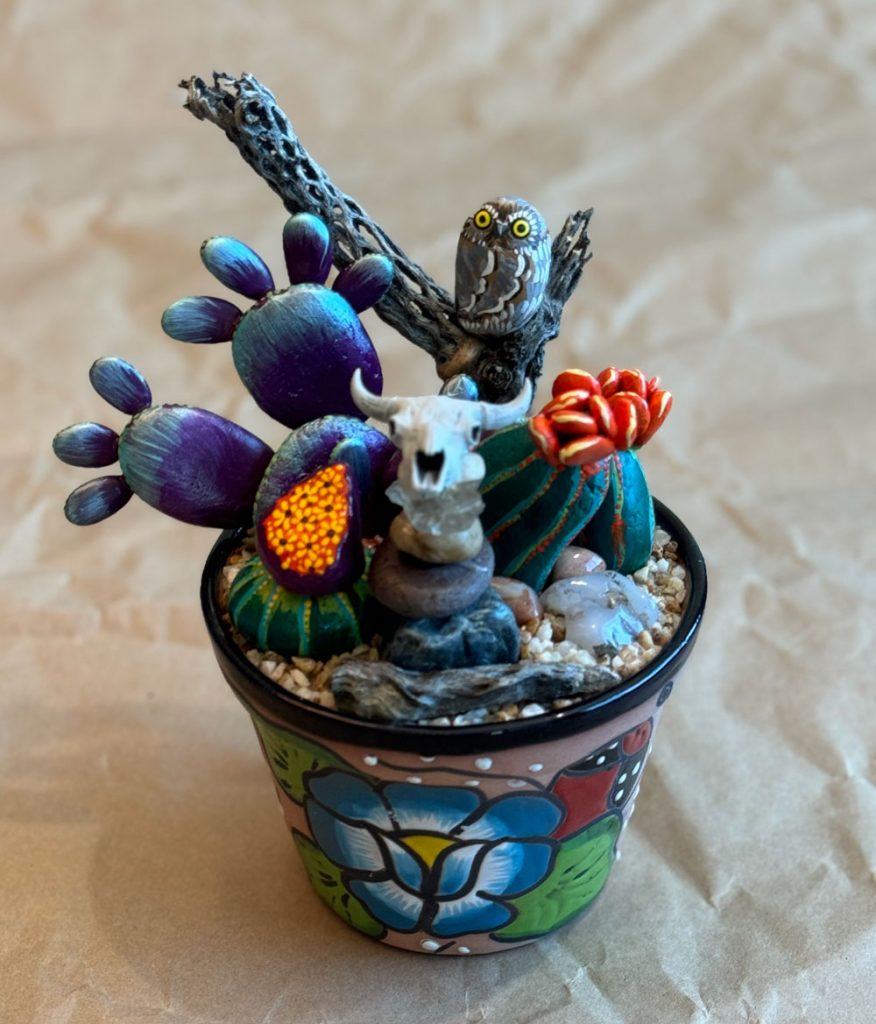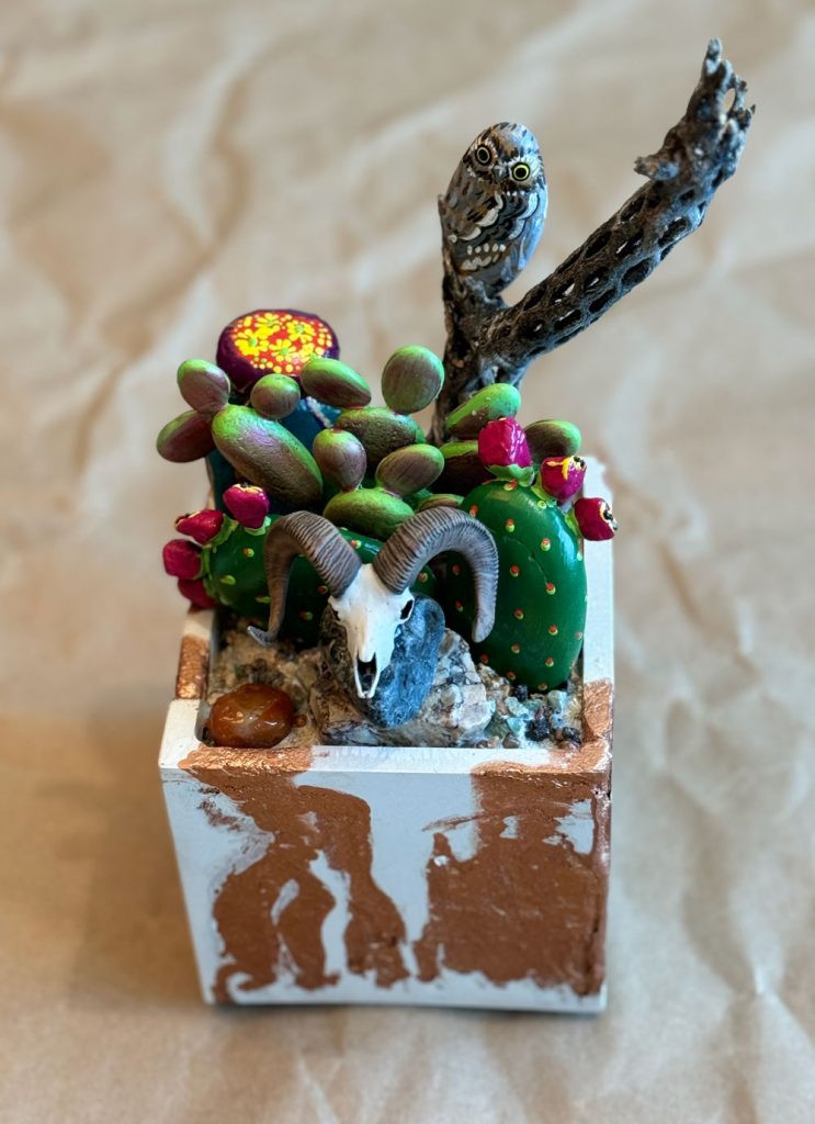 Desert plants represent a prickly pear, red blooming barrel and magenta cereus. Small stone cairn at center topped with miniature big horn sheep skull. Approximately 11″ tall x 6″ wide. Handmade pot has copper drips, a common mineral in our desert.