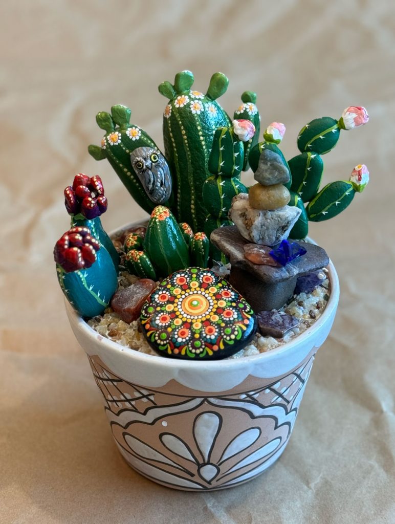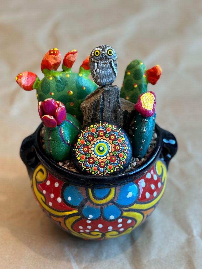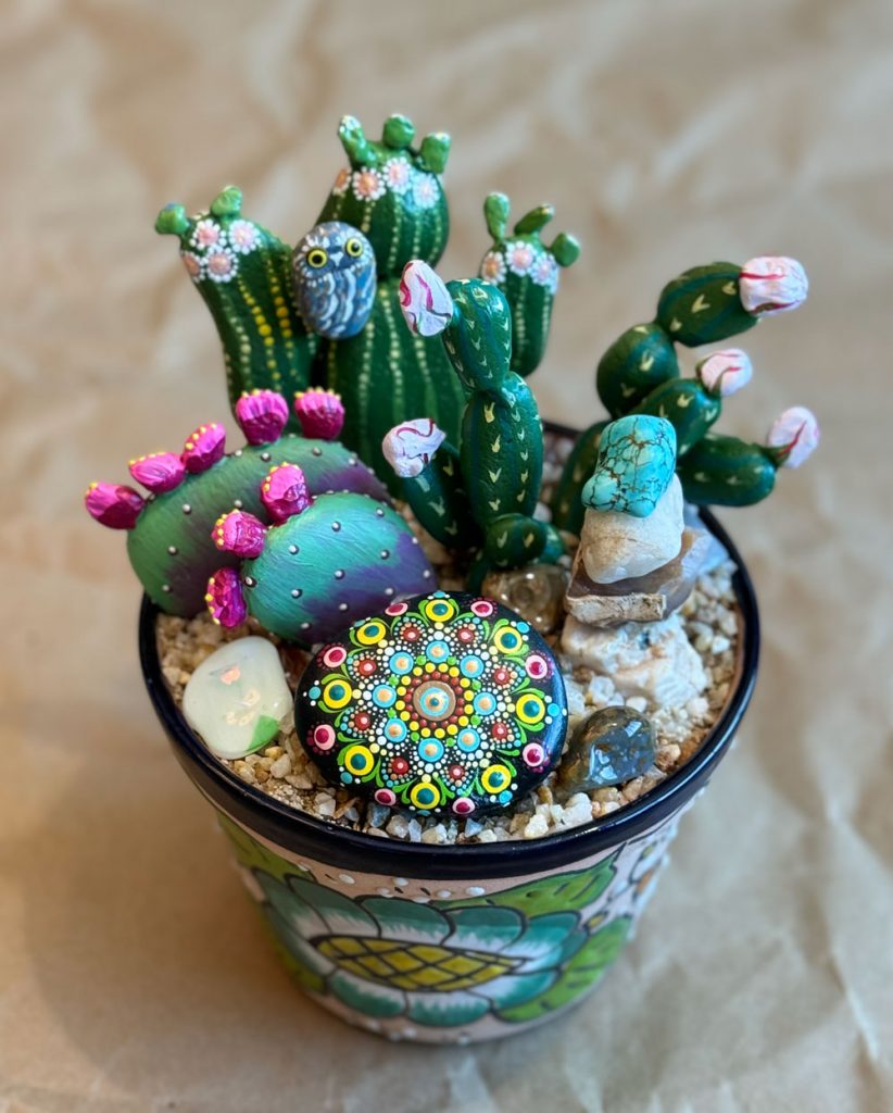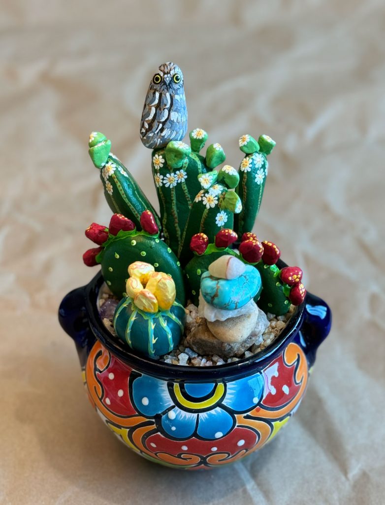 We spend a lot of our time camping and hiking in Southern Arizona and I’m always on the lookout for rocks that remind me of the shape of our varied types of cacti. Some are prickly pears, some Mexican fence posts, also cereus, barrels, pin cushions and totem poles. I like to add things I find in the Sonoran Desert like pieces of glass and interesting rocks. I paint miniature desert turtles, elf owls, and skulls. The mandalas are hand painted and repeat the colors of the design. They are fun!!!